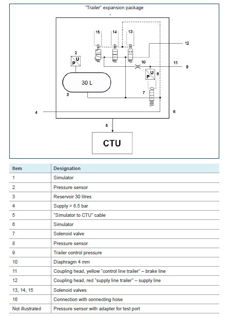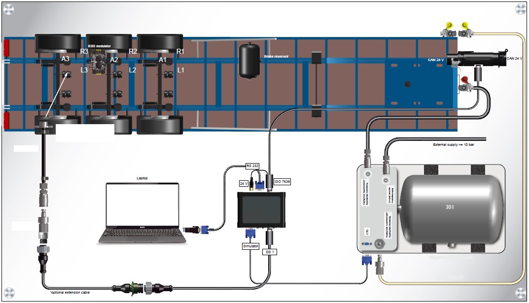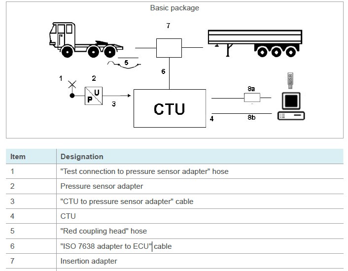 The basic package enables the electronic verification of the towing vehicle/trailer ISO 7638 port (EBS socket) as well as a towing vehicle/trailer simulation. The basic package is accommodated in an accessories case and includes the basic electronic equipment for the performance and evaluation of investigations. The basic package also includes components which are required in both the towing vehicle and the trailer (pressure sensor for the least favourably positioned wheel brake cylinder including a pressure sensor cable as well as connector element for the wheel brake cylinder and hose to the red coupling head).