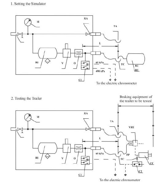 - It has a reservoir with a capacity of 30 liters which is charged to a pressure of 650 kPa before each test and which is not recharged during each test. At the outlet of the braking control device, the simulator incorporates an orifice with a diameter of from 4.0 to 4.3 mm inclusive. The volume of the pipe measured from the orifice up to and including the coupling head is 385 ± 5 cm3 (which is deemed to be equivalent to the volume of a pipe 2.5 m long with an internal diameter of 13 mm and under a pressure of 650 kPa). The control line pressures referred to in paragraph 3. of this annex is measured immediately downstream of the orifice.